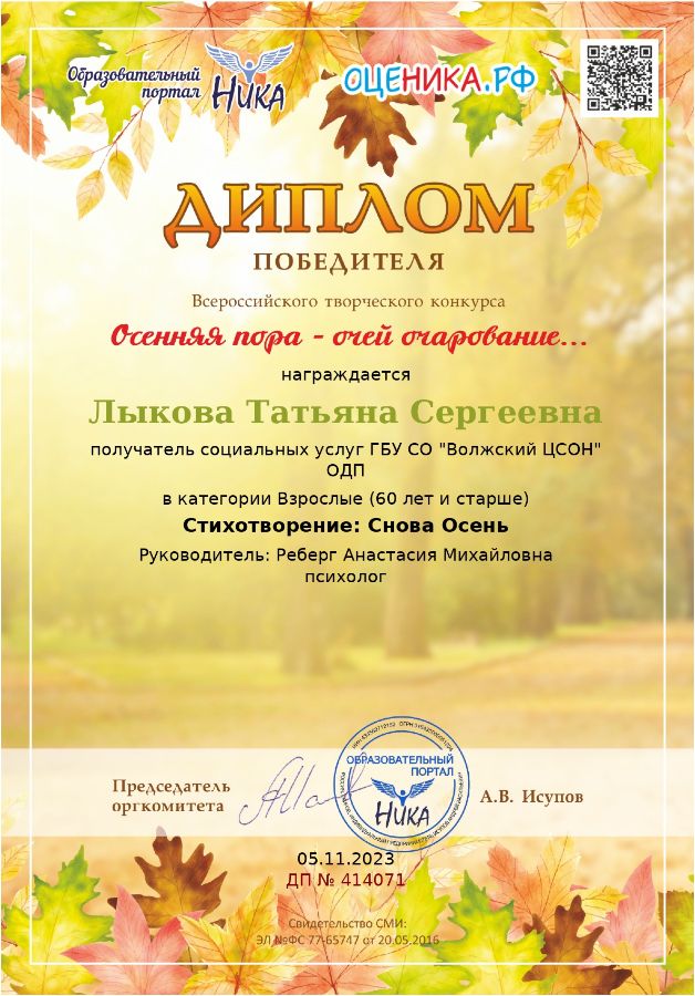 Лыкова Татьяна Сергеевна — получатель социальных услуг отделения дневного пребывания Волжского центра социального обслуживания населения, приняла участие и стала победителем во всероссийском творческом конкурсе образовательного портала «НИКА» в возрастной категории: взрослые (60 лет и старше).