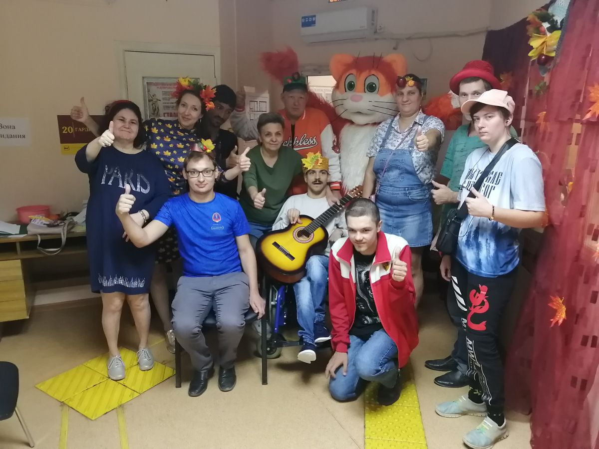 Молодого человека с инвалидностью пришли поздравить его друзья и Сказочный герой Рыжий кот.