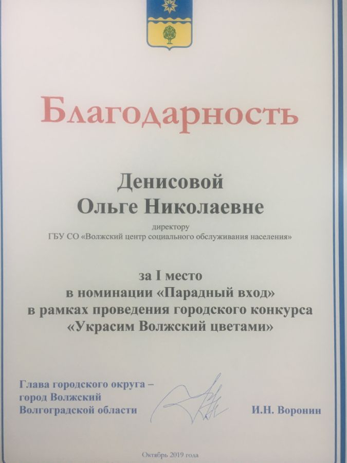 14 ноября 2019 года в Администрации г. Волжского состоялось торжественное вручение благодарственных писем по итогам проведенного городского конкурса «Украсим Волжский цветами». ГБУ СО «Волжский центр социального обслуживания населения» занял 1 место в номинации «Парадный вход» и получил подарочный сертификат на озеленение территории.